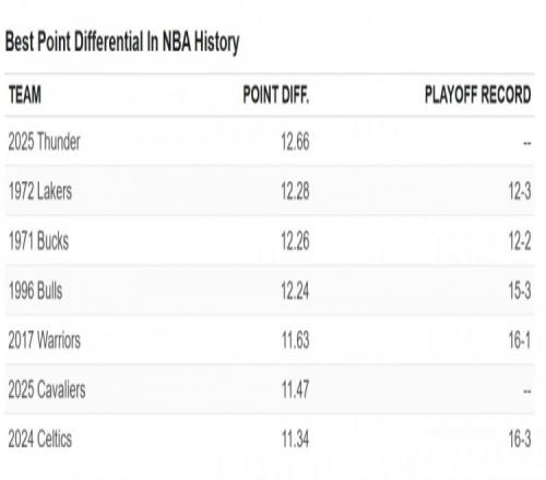 (图为NBA历史上的最高净胜分纪录,第一列为球队,第二列为场均净胜分,第三列为季后赛战绩)