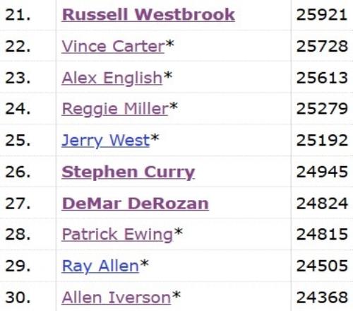 德罗赞生涯总得分超越尤因上升至历史第27位&排在他前面的是库里