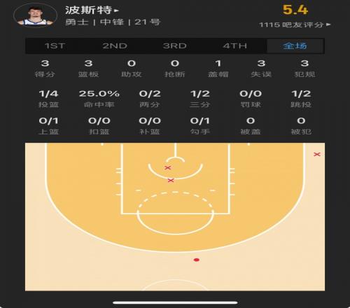 勇士52号秀 昆滕-波斯特 登场14.9分钟