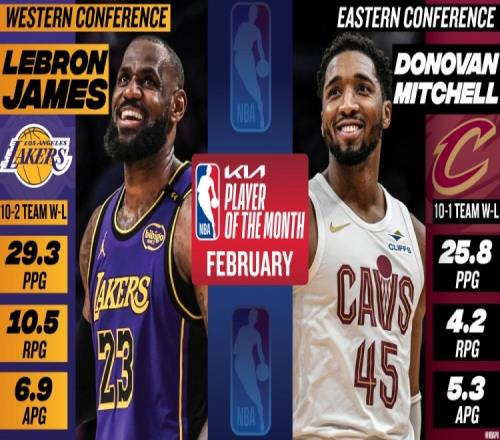 体育资讯3月5日报道宣称 今日NBA官方宣布,湖人球星勒布朗-詹姆斯和骑士球星多诺万-米切尔当选2月份西部和东部的最佳球员。