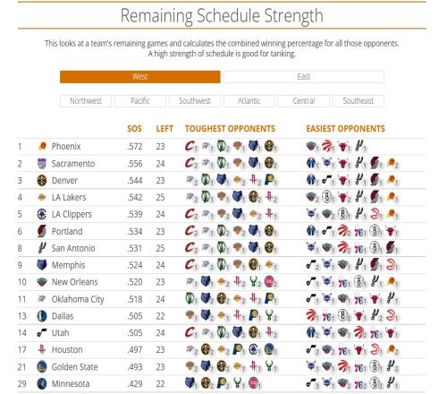 西部剩余赛程难度(最前面数字是赛程难度在联盟所有球队中的排名)