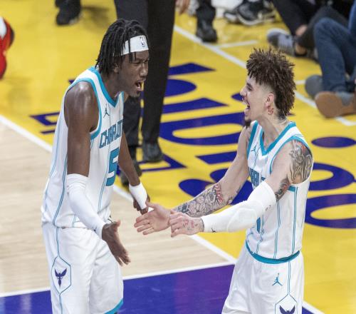 黄蜂官方晒出视频,拉梅洛-鲍尔和马克-威廉姆斯拿着手机分析起之前对阵湖人的比赛。