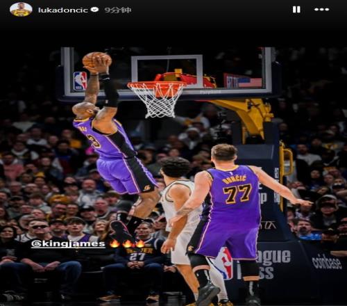 湖人球星东契奇更新ins,晒出了前天和詹姆斯空接的照片,并@了后者,配上了3个