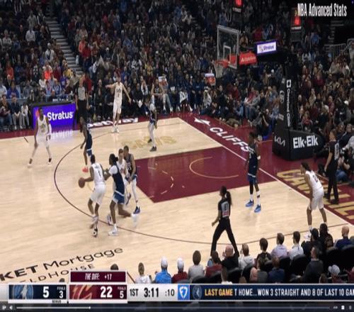 尽管本赛季爱德华兹的攻筐次数没那么多了,但他仍然在精进这个技巧,下图11月的比赛可能就是最好的例子,完全就是对巴恩斯的版本进行的“肮脏改编”。爱德华兹在攻筐时处于无球内切的状态,他在第一步之后就停了下来,最后以单腿抛投完成了得分: