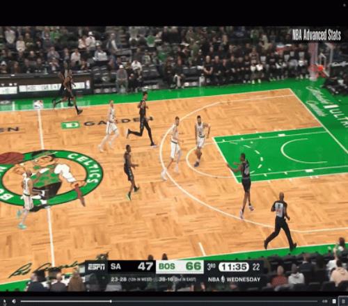 马刺队的巴恩斯就是这个动作的主要代表人物之一,下图的他利用这招成功造了塔图姆的犯规。注意看巴恩斯是如何在停球的时候做投篮假动作,然后右脚悬停在控制,左脚着地,然后出手投篮的: