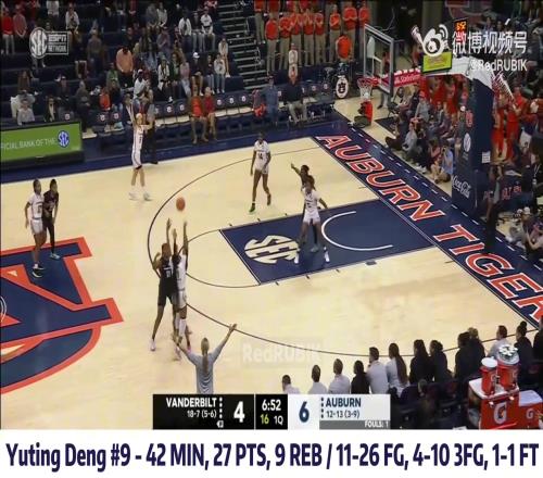 本场比赛,中国球员邓雨婷首发出战42分钟,26投11中,三分10中4,罚球1中1,得到全队最高的27分,另有9篮板进账。邓雨婷的27分是中国球员在NCAA D1中的最高得分纪录。