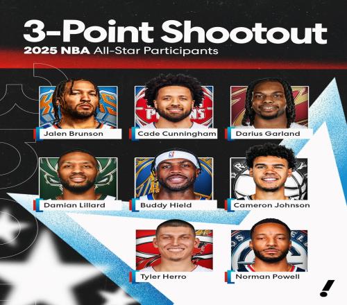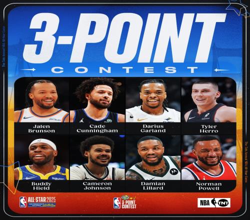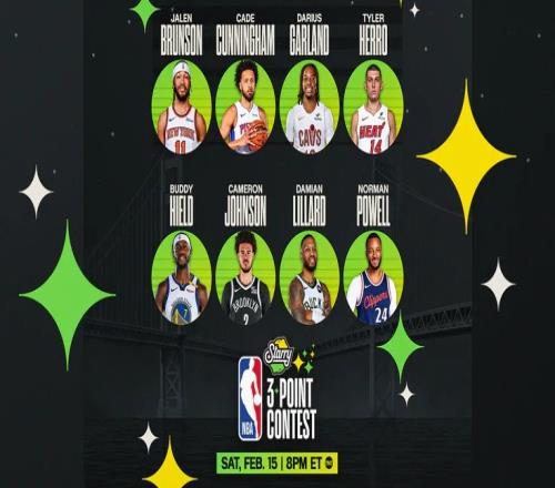 体育资讯02月16日报道宣称 NBA2025年旧金山全明星周末三分大赛在大通中心进行,参赛球员:布伦森(尼克斯)、凯德-康宁汉姆(活塞)、加兰(骑士)、利拉德(雄鹿)、希尔德(勇士)、卡梅隆-约翰逊(篮网)、希罗(热火)和诺曼-鲍威尔(快船)!