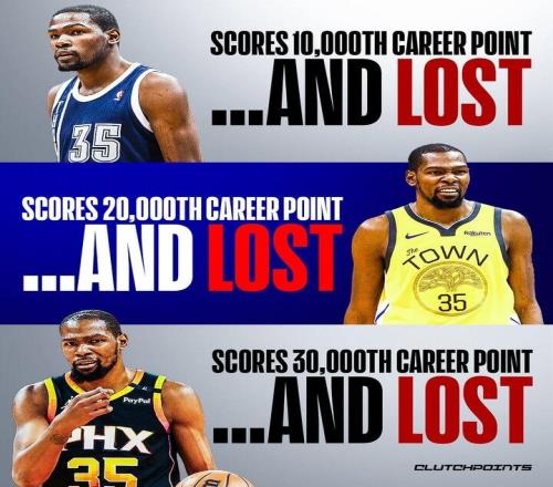不幸的是,杜兰特在得到生涯的1万分、2万分和3万分的比赛中,都没能帮助球队赢球,最终变成了里程“悲”。