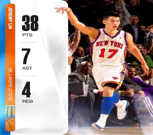 体育资讯2月12日报道宣称 13年前的今天,林书豪在面对湖人的比赛中爆砍38分。