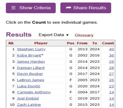 论得分爆炸力库里41次单节20+历史第一科比哈登表哥排24位