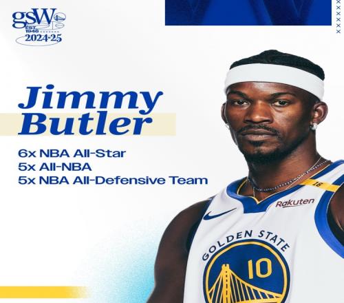 勇士官方也晒出照片欢迎巴特勒,并罗列了巴特勒的个人荣誉:6届全明星、5次入选最佳阵容、5次入选最佳防守阵容。
