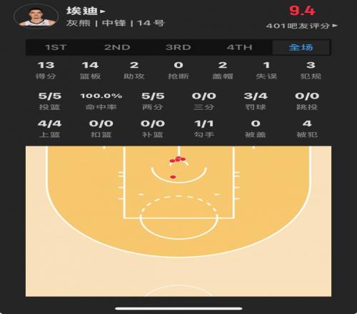 灰熊9号秀 扎克-埃迪 登场24.7分钟