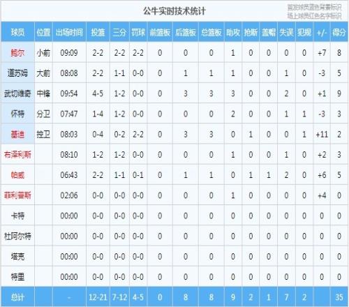 公牛开场后把三分作为主要进攻手段,首节他们三分手感也不错,一度连进4记三分。首节公牛全队三分12中7,其中鲍尔2中2。