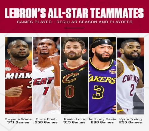 联手詹姆斯出战场数前五球员 下方数字代表共同出战场数