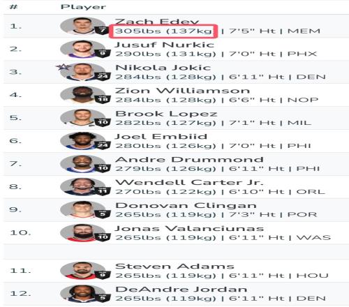 联盟第8重东契奇体重270磅超瓦兰亚当斯等内线锡安284磅
