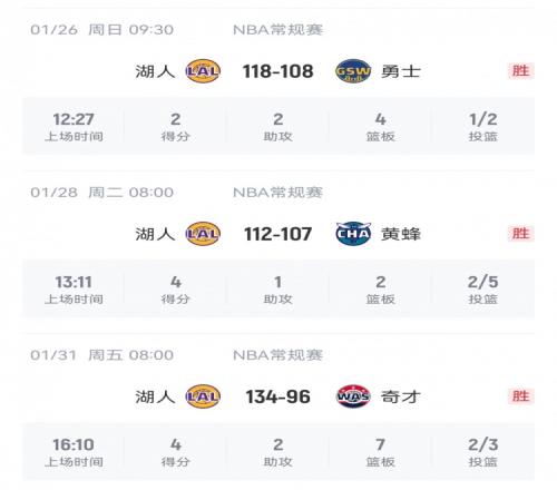 体育资讯1月31日报道宣称 NBA常规赛,湖人134-96大胜奇才。