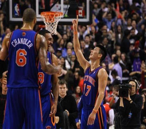 新华社照片,多伦多,2012年2月15日,尼克斯队球员林书豪(右)在比赛结束后庆祝胜利。当日,在2011-2012赛季NBA常规赛中,华裔球员林书豪在比赛结束前投进一个三分球,帮助纽约尼克斯队客场以90比87击败多伦多猛龙队,迎来球队六连胜。 新华社发(邹峥摄)
