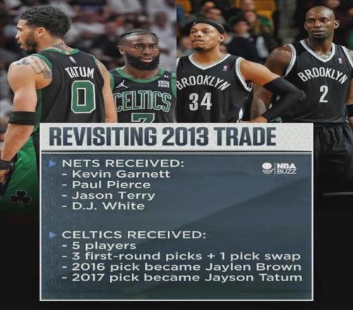 湖人换来保罗-加索尔排名第二。2008年2月,湖人送走夸梅-布朗、阿隆-麦基、克里丹顿、2个首轮、小加索尔签约权。第三是2013年夏天,凯尔特人把加内特和皮尔斯送到篮网,得到3个首轮签+1首轮互换,后来用这些首轮签选中双探花。