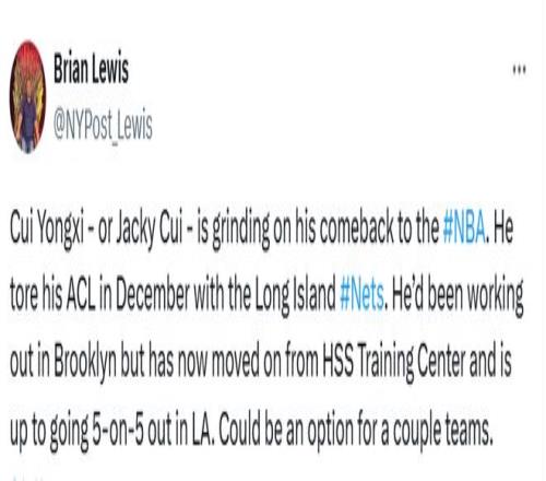 Lewis晒出崔永熙的训练视频,配文写道:“崔永熙正为重返NBA全力备战。去年12月,他效力于长岛篮网队(布鲁克林篮网队下属G联赛球队)期间遭遇前交叉韧带撕裂。”