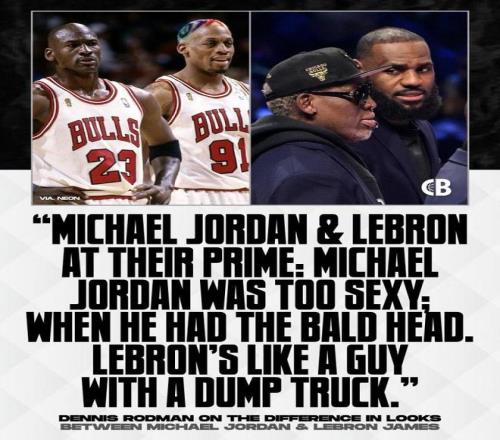 “巅峰乔丹太性感了,特别是当他留光头以后。詹姆斯则看起来像个开翻斗卡车的人。”罗德曼说道。