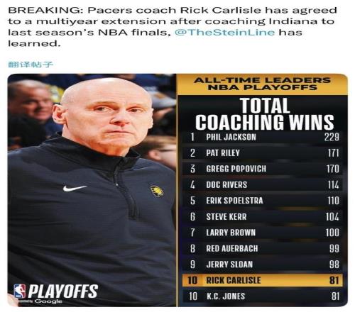 2021年卡莱尔重回步行者,他的执教能力有目共睹,他还是NBA教练协会的主席,执教生涯已经收获81场季后赛胜利,追平KC-琼斯并列历史第十位。