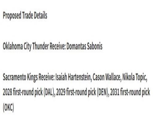 具体方案如下:雷霆得到:小萨博尼斯,国王得到:哈滕+华莱士+托皮奇+28年来自独行侠首轮签+29年来自掘金首轮签+31年雷霆首轮签(雷霆最不缺首轮)。首先,对国王来说,和小萨博尼斯分手只是时间问题。国王当初在哈里伯顿和福克斯之间选择后者,上赛季哈里伯顿已经带队打到总决赛,而国王最终用福克斯换来了拉文!休赛期国王一直在追求库明加,引发的后果是蒙克随时准备离开,德罗赞也可能成为牺牲品,算上拉文的累赘合同,国王很难进西部前十。小萨博尼斯从上赛季就不满球队缺乏竞争力,和球队关系一般。