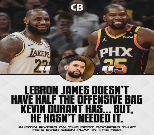 勒布朗詹姆斯成为了NBA历史上得分最多的球员,在NBA征战20多年,也是被视为进攻专家,进攻手段也是非常丰富。最近,前NBA球员里弗斯在节目中表示,即便勒布朗詹姆斯比凯文杜兰特更伟大,得分比凯文杜兰特多,可是他的得分能力,依旧不如凯文杜兰特。而且,他还表示勒布朗詹姆斯的进攻武器,不如凯文杜兰特多,只有对方的一半。