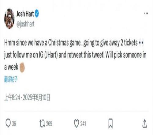 尼克斯后卫哈特发推送球票,他表示:“既然我们要打圣诞大战,那么请在IG上关注我,并转发这条推文,我会在1周内选人送2张球票。”
