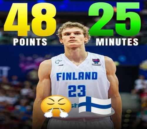 芬兰以105-62大胜比利时,马尔卡宁全场仅仅出战25分钟,24投17中,其中三分球13投7中,狂砍48分9篮板3抢断和1封盖。48分也打破了马尔卡宁2022年欧洲杯创下的43分国家队得分纪录。