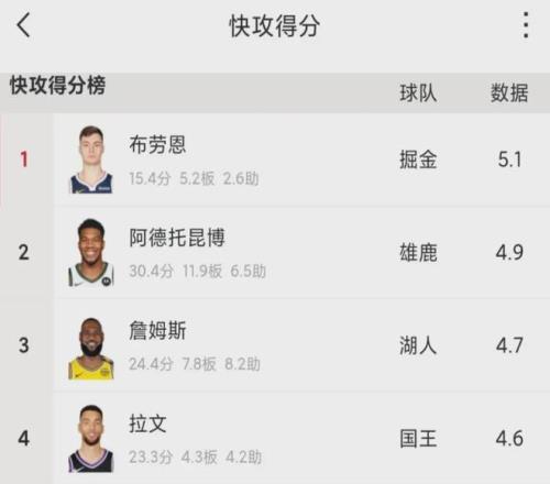 凭借着出色的快攻意识以及不错的远投准星,布劳恩场均贡献15.4分5.2篮板2.6助攻,三项命中率分别是58%、39.7%和82.7%。