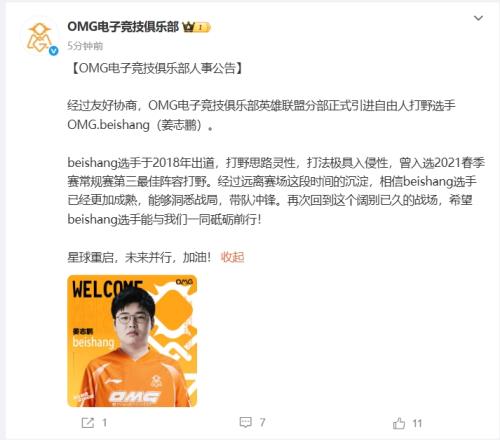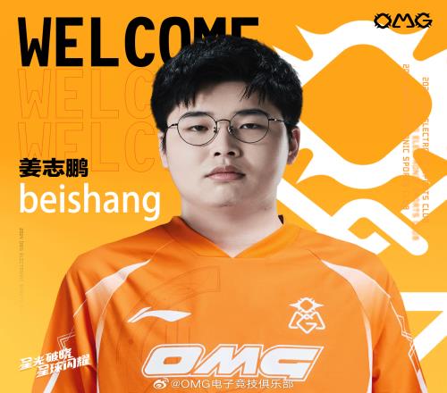“经过友好协商,OMG电子竞技俱乐部英雄联盟分部正式引进自由人打野选手OMG.beishang(姜志鹏)。
