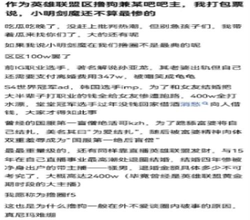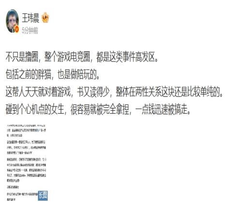 体育资讯4月26日报道宣称 近日主播小明剑魔直播中曝出与妻子因财产问题而吵架等引起广泛讨论,体坛周报记者王玮晨更博锐评:不只是撸圈,整个游戏电竞圈,都是这类事件高发区。