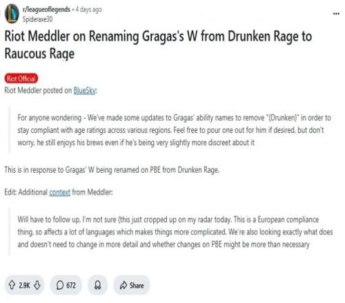 -拳头移除格雷福斯的雪茄都多久了?现在又要删掉古拉加斯所有酒精相关的元素。但女角色那些暴露的服装呢?屁都不改?笑死。克烈的脏话怎么说?约里克提到的尸体呢?啊这些就都没问题是吧?但酒和烟?绝 对 不 行。