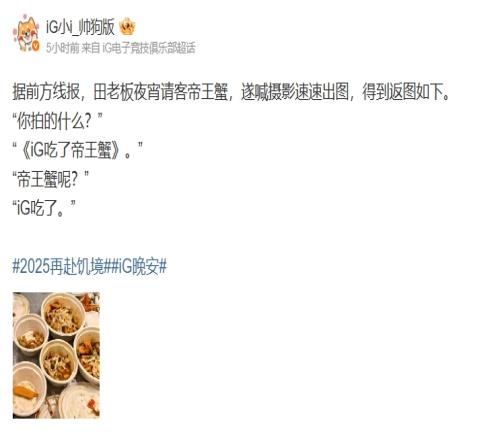 JKL不来谁都别动筷iG晒赛后聚餐:田老板夜宵请客帝王蟹