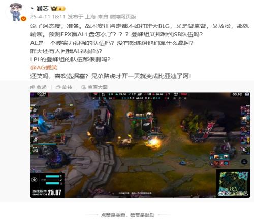 体育资讯4月11日报道宣称 LPL第二赛段组内赛AL首局不敌FPX,赛后涵艺更博:说了阿态度,准备。战术安排肯定都不如打昨天BLG,又是背靠背,又放松,那就输呗。预测FPX赢AL1盘怎么了???登峰组又那种纯SB队伍吗?