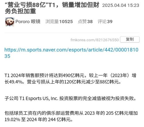 T1俱乐部24年营收490亿但仍亏损88亿包选手在内运营费用达244亿