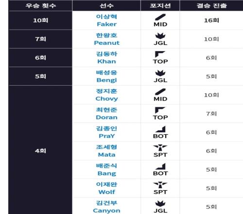 体育资讯4月6日报道宣称 近日,有韩国网友统计了LCK冠军数排名以及决赛次数,其中“大魔王”Faker共拿到10座LCK的联赛冠军,并16次率领队伍打入决赛。