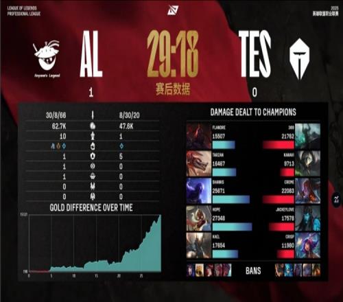 后期369偷红被抓化身团灭发动机,AL打出1换4,AL随后两度入侵TES野区抓人得手,最终AL轻松冲上TES高地,JackeyLove战绩锁定在1-6,AL推平TES基地先下一城。