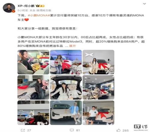 体育资讯4月1日报道宣称 IT之家 3 月 25 日消息,小鹏汽车董事长何小鹏在微博发文,透露小鹏 MONA M03 下周累计交付量将正式突破 10 万辆,同时其表示 MONA M03 的大部分车主年龄在 30 岁以内,00 后占比超两成,女性占比超四成。