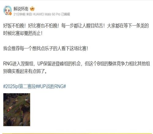 体育资讯3月28日报道宣称 2025LPL第二赛段小组赛,RNG加赛不敌UP落败,赛后解说怀南发文点评本场比赛。