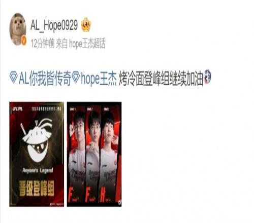 在最终结果出炉后,AL的ADC选手Hope更新博文:烤冷面登峰组继续加油!