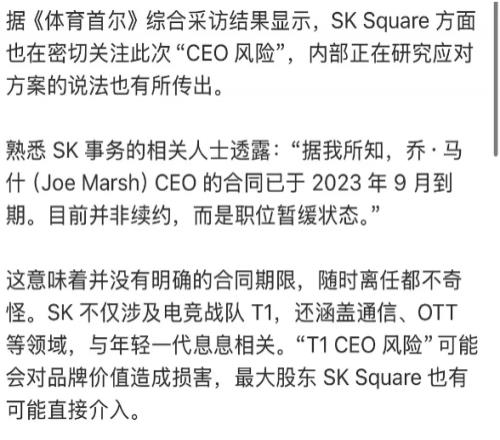 T1CEO恐将离任韩媒:JoeMarsh未与SK通讯续约且SK股东高度关注舆论