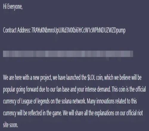 LOL首席设计师的X账号被盗,并宣称发布加密货币LOL币