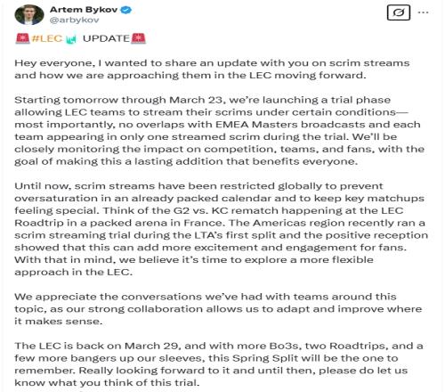 建议LPL效仿!LEC同意队伍直播训练赛,但不能与比赛直播时间段重叠