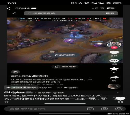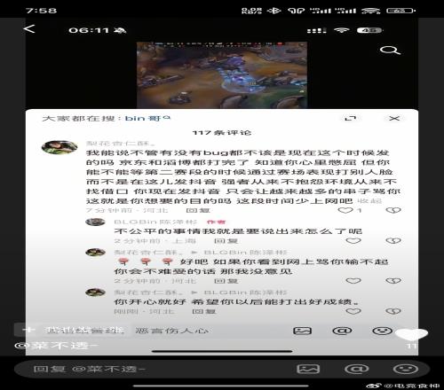 体育资讯2月28日报道宣称 今日,有网友发现BLG上单Bin选手疑似在凌晨5点左右发布了抖音视频,视频中内容是对阵TES第三局比赛的最终团Bin奎桑提单切JackeyLove的画面,并且配文:认真对待整局最后却因为bug输掉比赛,谁会想到结局会是这样!