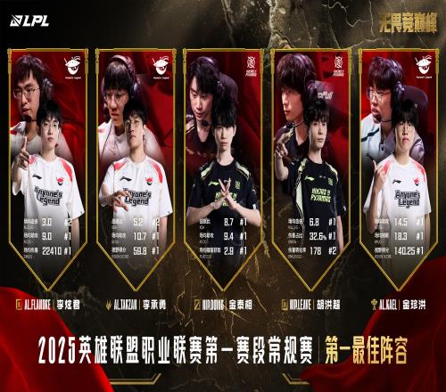 2025LPL第一赛段常规赛最佳阵容三阵:TheShy、Kanavi、Knight、Peyz、Feather