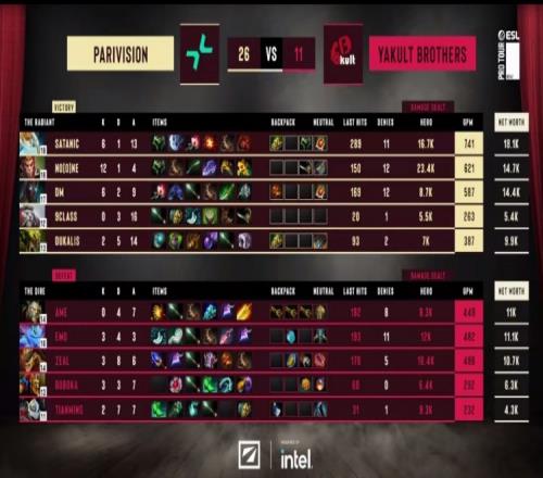 第一局YB在选出狼人钢背后,PARI拿出小娜迦克制,对线期后,本该发力的钢背兽被针对,随着紫苑出炉,Emo帕克也被弄得无秀的空间,小娜迦各种单杀,YB无法处理,24分钟打出GG。