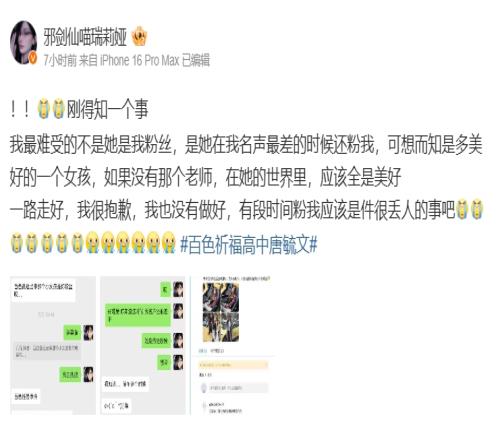今日,刀妹女主播“邪剑仙喵瑞莉娅”也更博称刚得知这位女生曾是她的粉丝,并且是在自己名声最差的时候关注的。