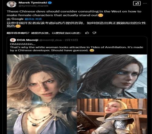 在2月13日举办的索尼State of Play发布会上,国产单机骑士幻想动作游戏《湮灭之潮》公布了首个预告片,并在之后公布了长达11分钟的实机演示,引起国内外大量玩家的关注。Marek Tyminski也转发了本作女角色们的截图,并表示:“这些中国开发者们真该考虑为西方提供咨询,教教他们如何打造出真正脱颖而出的女性角色!”