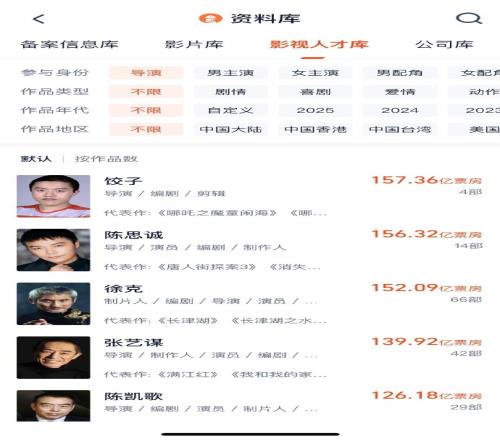 在榜单中,饺子目前总票房157.36亿第1,陈思诚156亿第2,徐克、张艺谋、陈凯歌分居3-5名。
